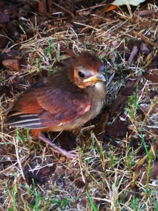 Late last week sitting on the front steps waiting for Tucker’s bus, I heard a symphony of chirping and caught the commotion out of the corner of my eye. Sitting precariously in a nest toward the end of a low hanging branch, was a nest of two baby Cardinals. With mouths open wide, necks eagerly reaching up toward their mommy as she delivered another meal.