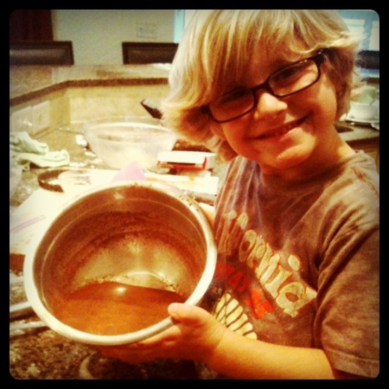 When all the pies were done and baking away, my little assistant went to town cooking his own delight. While a recipe doesn’t exactly exist for his creation, I’m pretty sure, based on a few things I saw him add from the pantry, that what he made could possibly kill you. Even the dogs didn’t take an interest in what was hitting the floor. Nevertheless, he loves to “cook” and I’m happy to clean up his mess when he’s done creating.